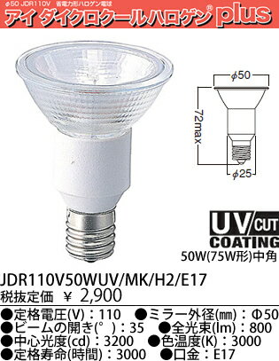 アイ ダイクールハロゲン UVカットカバーガラス付(省電力タイプ) 110V用50W(75W形)Φ50(中角) E17 JDR110V50WUVMKH2E17【ポイント2倍】 従来形に比べ、10~20%の省電力。E17口金です。【関連商品】 アイ ダイクールハロゲンUVカットカバーガラス付(省電力タイプ)110V用30W(50W形)Φ50(狭角) E17価格1,390円アイ ダイクールハロゲンUVカットカバーガラス付(省電力タイプ)110V用30W(50W形)Φ50(中 ・・・もっと見てみる |